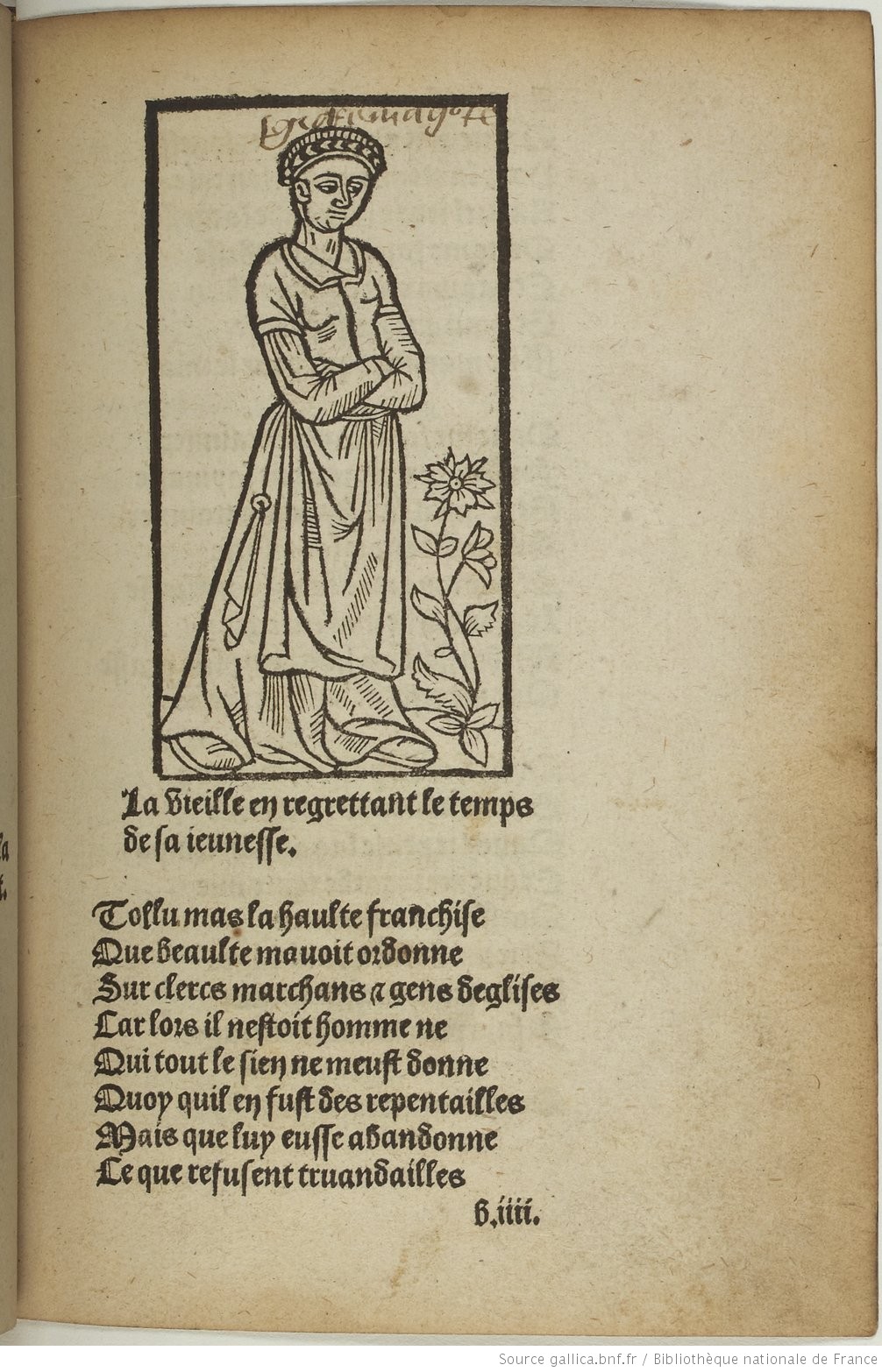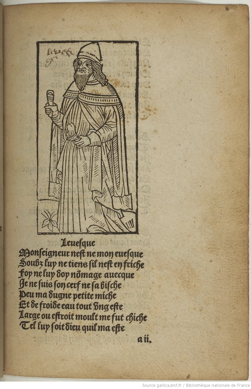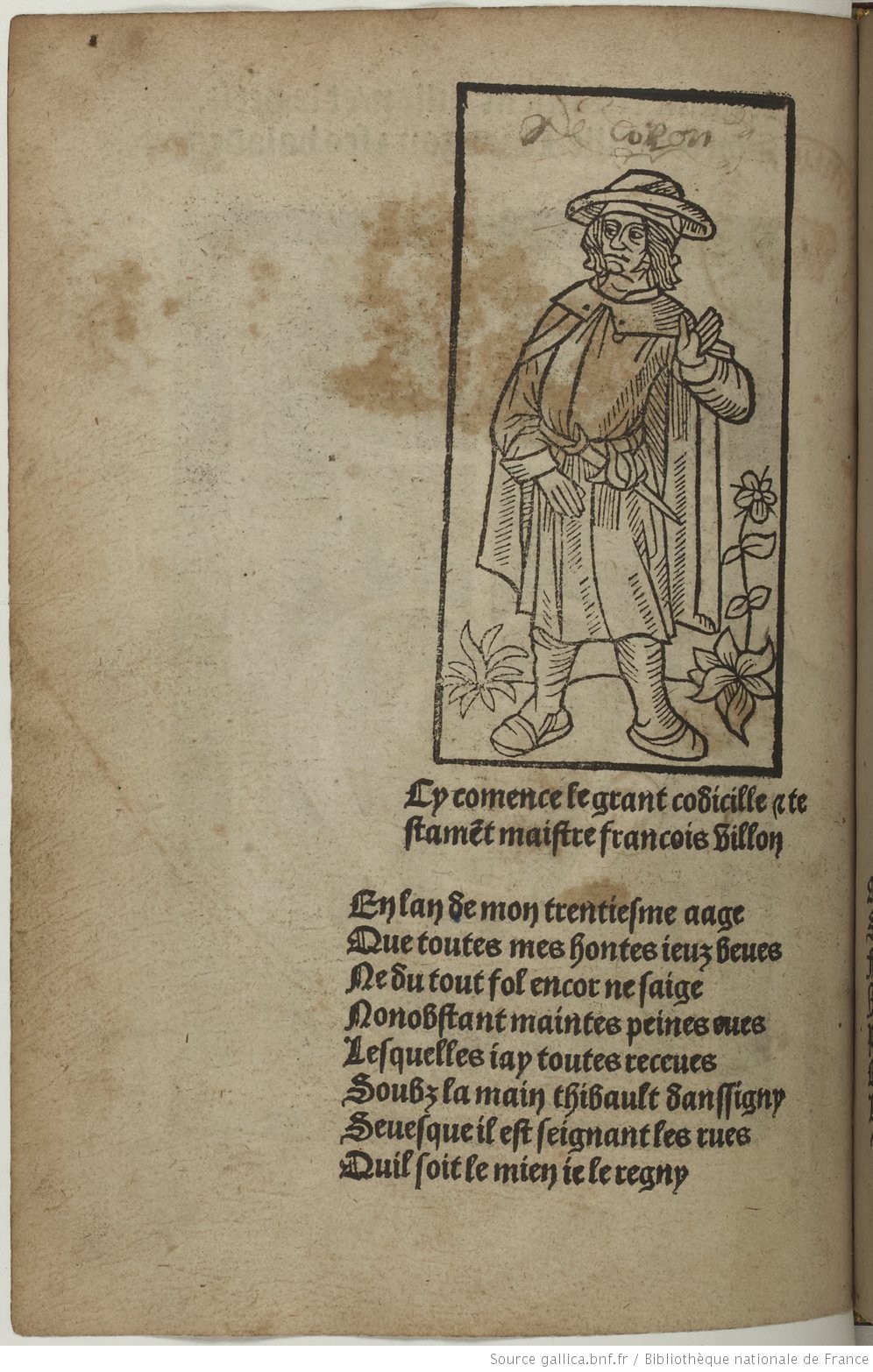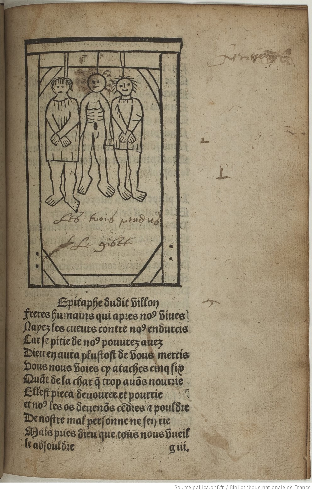 Album photos : BnF, réserve des livres rares, YE-238 ; la gravure de Villon (xylographie) est répétée 5 fois : vues 2, 22, 43,70, 88 ; celle de la dame 3 fois : vues 23, 44, 71 ; s’y ajoutent l’évêque en vue 3 et les pendus, gravure bien connue, en vue 89.