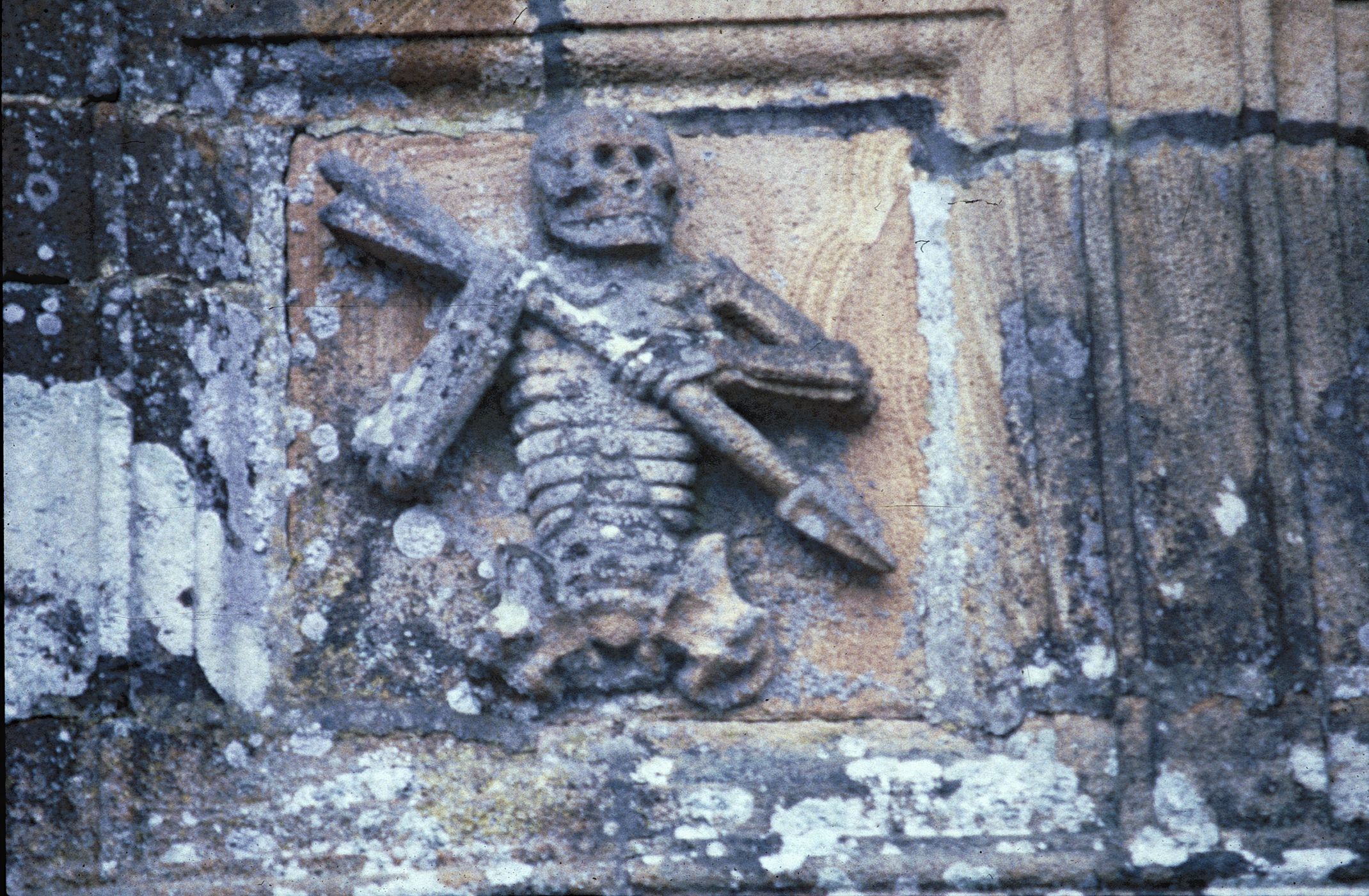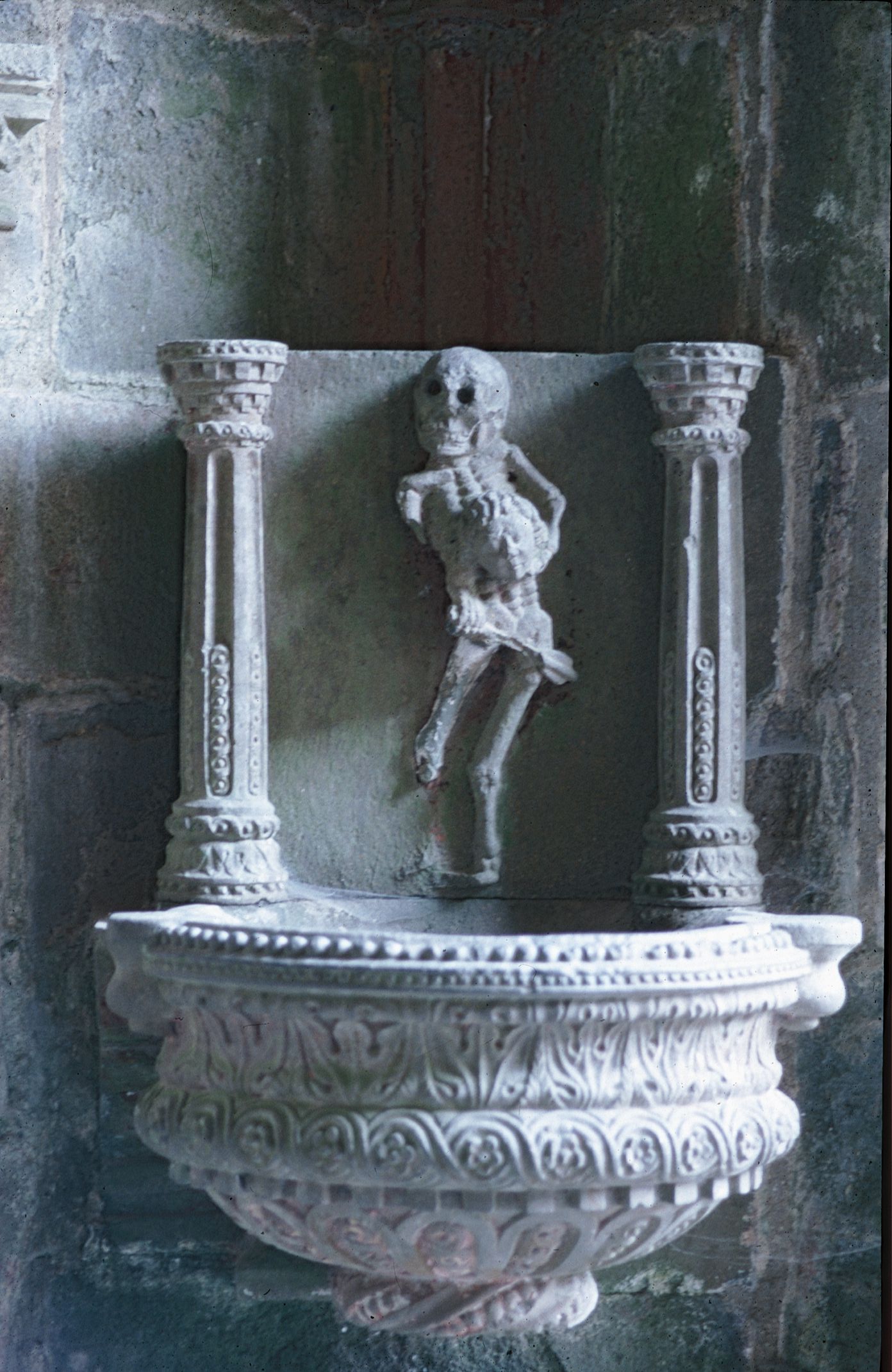 Saint-Hervé : sur la voûte du porche sud de l'église paroissiale (squelette au linceul, nemini parco) (Côtes d'Armor).