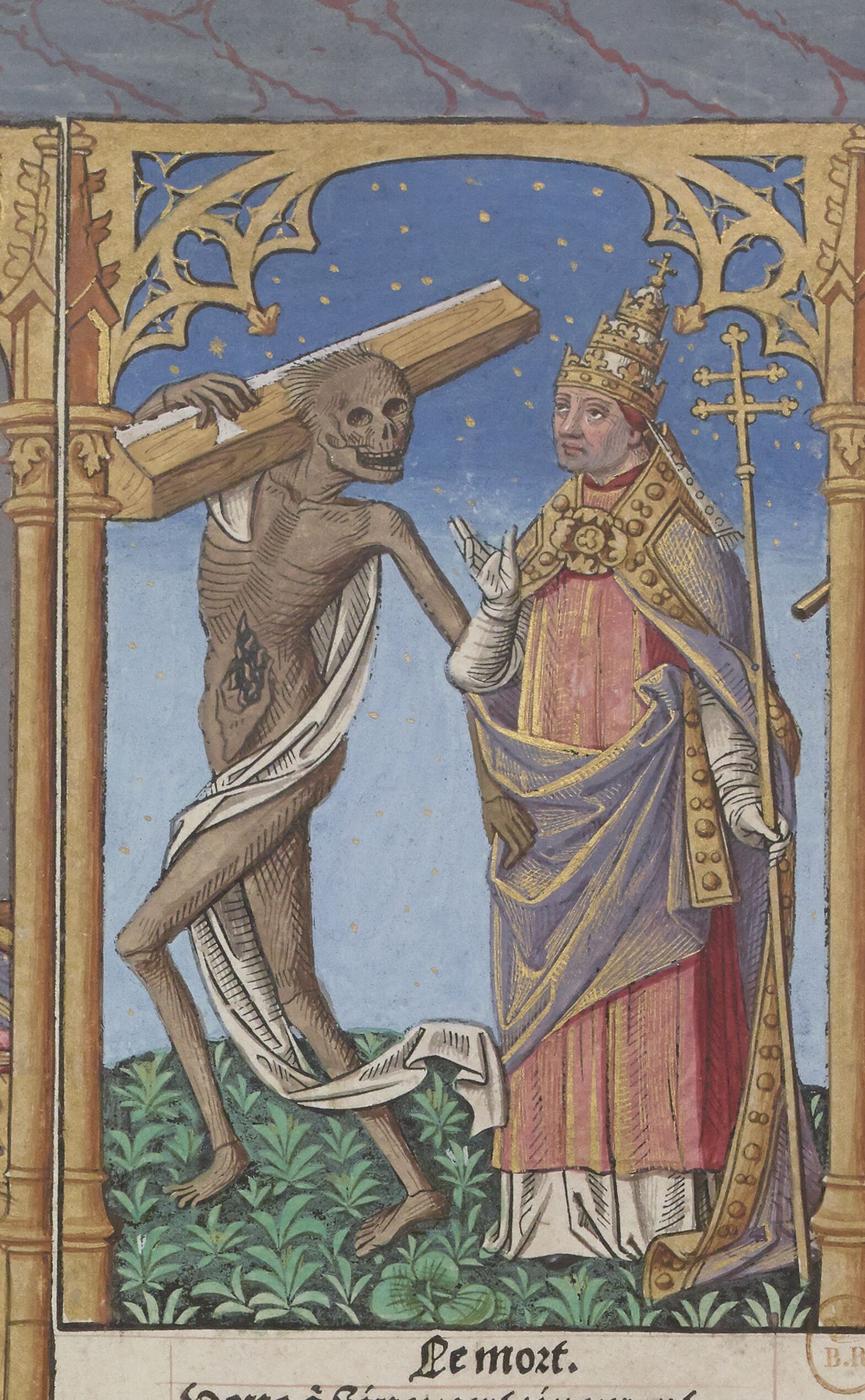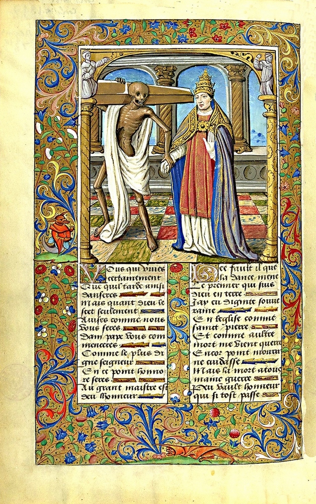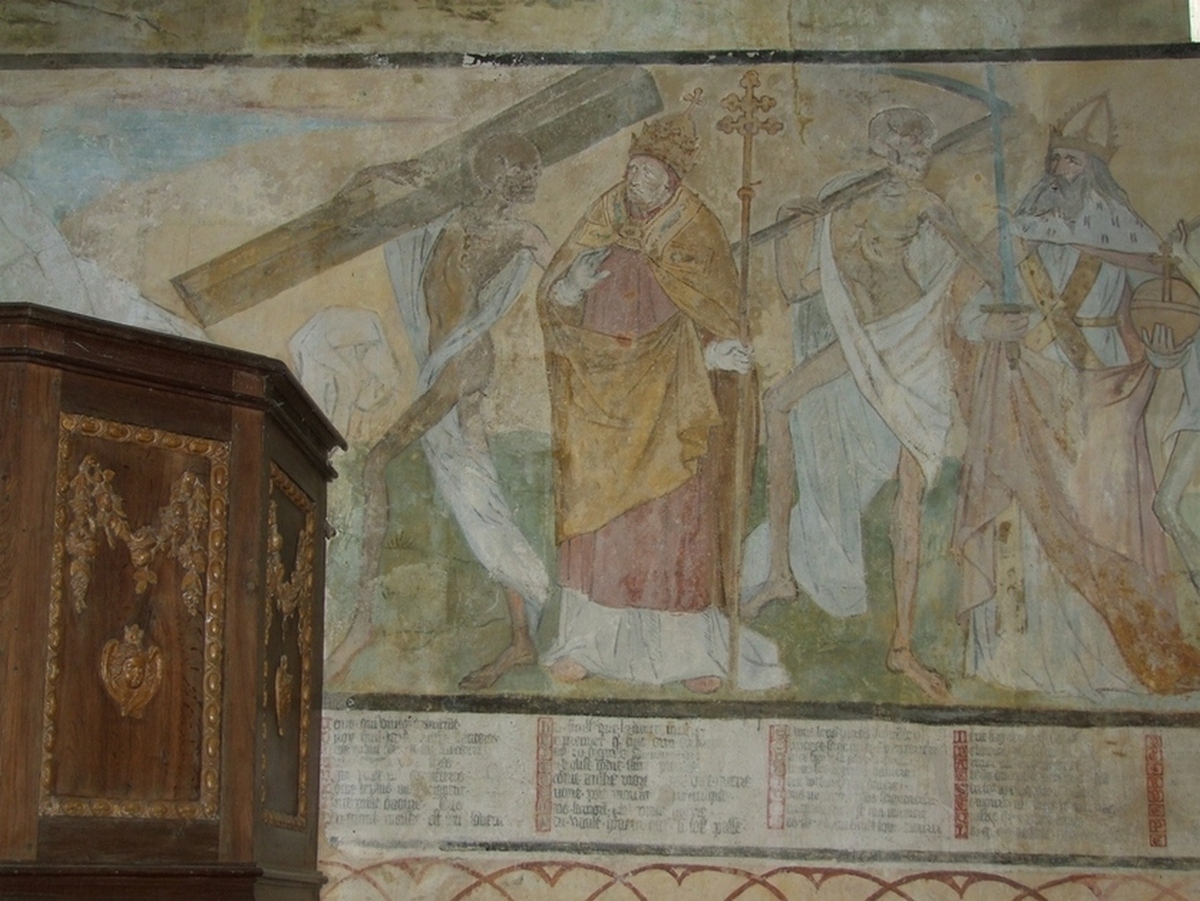 Les peintures du pape et de son mort sont presque identiques à Lübeck et à Reval comme nous l’avons écrit plus haut. Elles ne ressemblent pas à Guyot Marchant, peu au manuscrit 995 et nettement plus au Jacques de Besançon, BnF, Réserve Te-8. De plus nous présentons le pape de la Danse macabre de Meslay le Grenet (France, Eure et Loir, voir cette page) et laissons le lecteur apprécier…