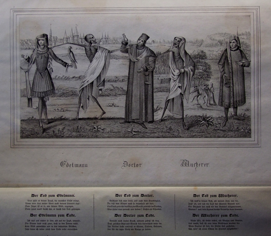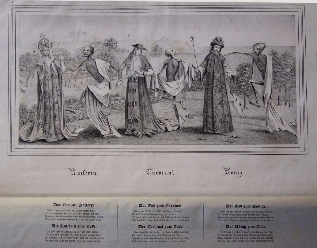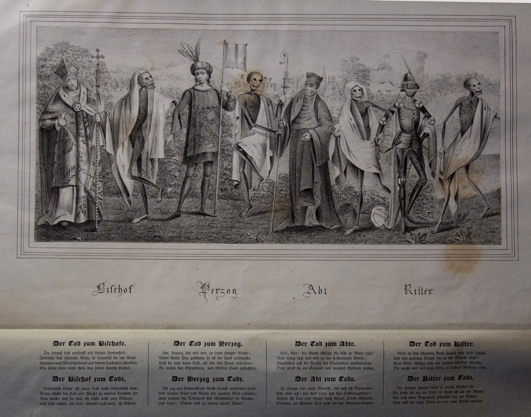 Ces gravures sont très fines, très bien réalisées et imprimées, le moindre détail est perceptible. La tiare du pape est ici plus haute et plus fine, la croix n’est pas identique et il faut voir avec quelle élégance le mort saisit la cape, l’auriculaire délicatement relevé ! La main de l’impératrice est tout aussi fine et délicate qu’à Reval et celle du cardinal est mieux proportionnée. Le duc paraît un homme jeune, debout de face, tenant un étendard dans la main gauche ; il est probablement en armure, visible au niveau des membres inférieurs - avec les poulaines - et s’il est en cotte de mailles il porte un tabard ouvragé et brodé ; mais là s’arrête la comparaison possible avec le connétable ; il porte une haute coiffe civile agrémentée de grandes plumes comme il se doit (attributs des coiffures de la noblesse, la taille des plumes devait être proportionnelle au rang). Le mort suivant ne le saisit pas, ce qui est inhabituel et se trouve aussi chez le chevalier - mais il a saisi la crosse de l’abbé à deux mains. La main du noble qui tient l’épervier n’est pas gantée, ce qui est une erreur. Entre le mort et l’usurier on retrouve la dame et les deux morts dont l’un joue du violon, confirmant qu’il ne s’agit pas d’une peinture d’origine (le violon n’existait pas en 1463). Chez la jeune fille le mort a saisi sa manche par l’arrière et pour l’enfant le mort porte un faux.