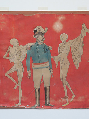 Albert Boudon-Lashermes est un érudit local du Puy et du Velay. La danse macabre représente les caricatures de personnes qui ont existé - des militaires, un poète, un facteur, un curé… Même Albert Boudon s’est représenté sur la souche de son arbre généalogique qui tombe en morceaux. Il reste un travail iconographique à réaliser pour savoir qui est représenté. Cette frise étant inspirée par la Danse macabre de La Chaise-Dieu, Il y a sans doute des parallèles à faire. "Enfin, les vêtements sont suffisamment bien dessinés pour appuyer une note vestimentaire ; on peut aussi faire des recherches sur le papier à la molette des Papeteries Canson et Montgolfier toutes proches", conclut le restaurateur.