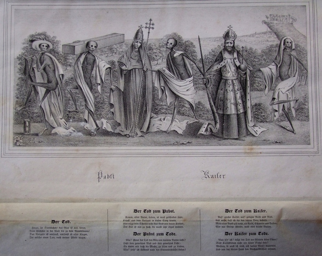 Ces gravures sont très fines, très bien réalisées et imprimées, le moindre détail est perceptible. La tiare du pape est ici plus haute et plus fine, la croix n’est pas identique et il faut voir avec quelle élégance le mort saisit la cape, l’auriculaire délicatement relevé ! La main de l’impératrice est tout aussi fine et délicate qu’à Reval et celle du cardinal est mieux proportionnée. Le duc paraît un homme jeune, debout de face, tenant un étendard dans la main gauche ; il est probablement en armure, visible au niveau des membres inférieurs - avec les poulaines - et s’il est en cotte de mailles il porte un tabard ouvragé et brodé ; mais là s’arrête la comparaison possible avec le connétable ; il porte une haute coiffe civile agrémentée de grandes plumes comme il se doit (attributs des coiffures de la noblesse, la taille des plumes devait être proportionnelle au rang). Le mort suivant ne le saisit pas, ce qui est inhabituel et se trouve aussi chez le chevalier - mais il a saisi la crosse de l’abbé à deux mains. La main du noble qui tient l’épervier n’est pas gantée, ce qui est une erreur. Entre le mort et l’usurier on retrouve la dame et les deux morts dont l’un joue du violon, confirmant qu’il ne s’agit pas d’une peinture d’origine (le violon n’existait pas en 1463). Chez la jeune fille le mort a saisi sa manche par l’arrière et pour l’enfant le mort porte un faux.